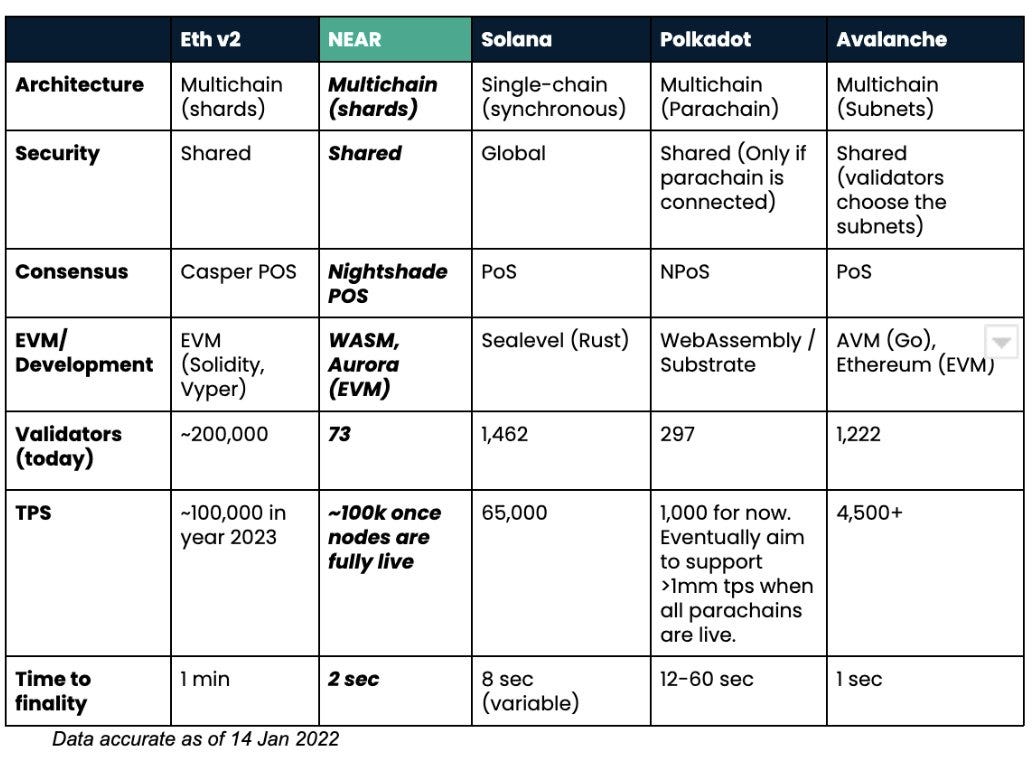 As of December 2021, there were over 400 total developers building within the NEAR ecosystem (6th most behind only Bitcoin, Ethereum, Solana, Polkadot, and Cosmos). This was a 400+% increase from about 100 developers in December 2020. NEAR Protocol also uses a delegated proof-of-stake (PoS) mechanism, similar to what other blockchains like EOS, TRON, COSMOS are using. For nodes who want to become a validator, they will need to stake the $NEAR tokens to participate in the validation process. The table below compares the NEAR Protocol with her peers like SOLANA, POLKADOT and AVALANCHE.